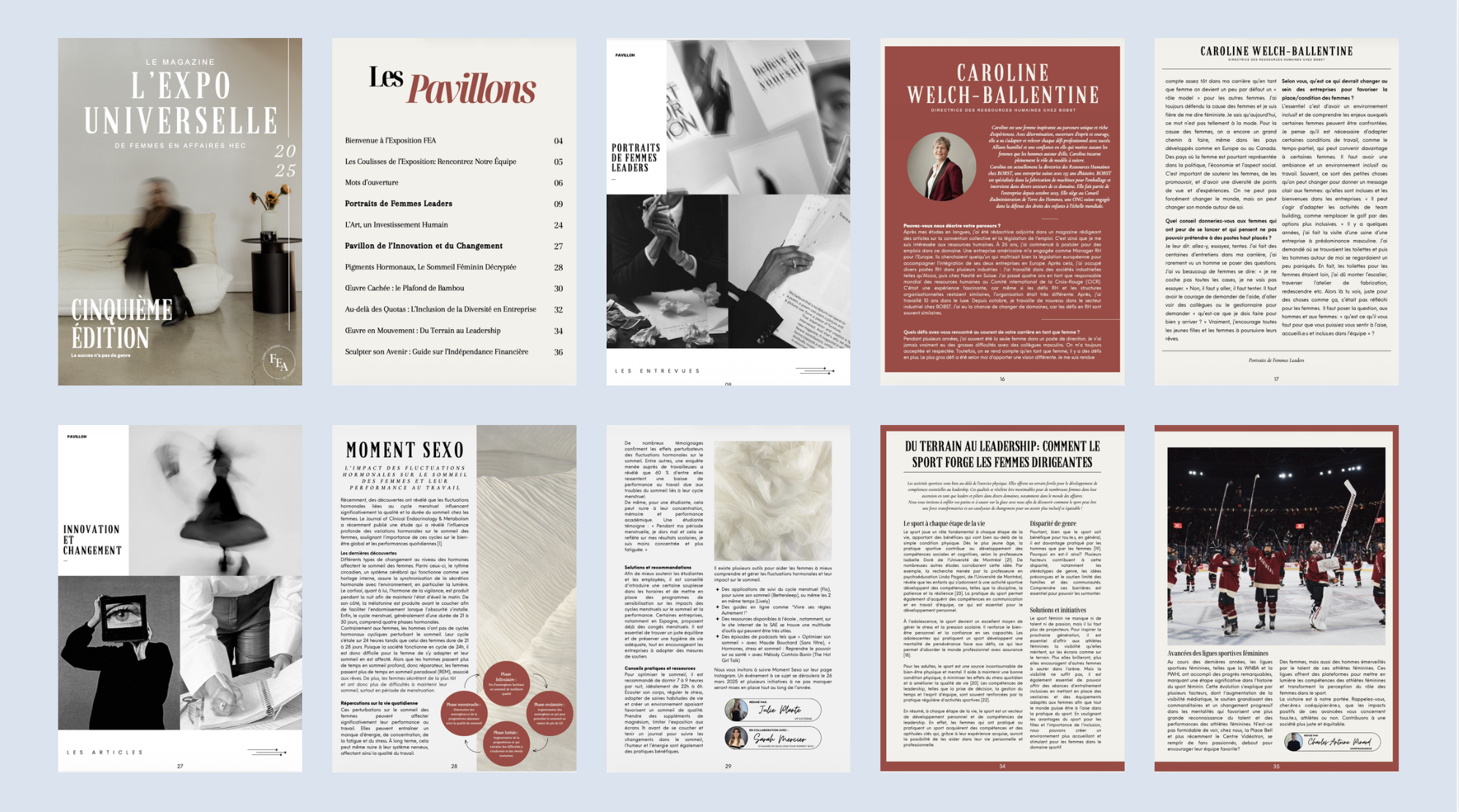 Le design du magazine Femmes en Affaires (5e édition) a été un projet central dans la redéfinition de l’identité visuelle du comité. Cette édition marquait un virage assumé vers une direction artistique plus chic, épurée et cohérente, en rupture avec les éditions précédentes.